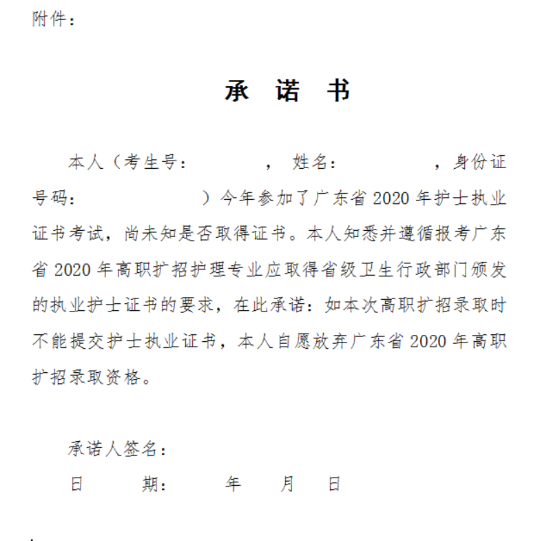 今年我省執(zhí)業(yè)護(hù)士證書考試受疫情影響推遲,現(xiàn)由于主辦單位尚未發(fā)放今年考試合格的考生證書,經(jīng)研究,決定先準(zhǔn)予今年已參加我省執(zhí)業(yè)護(hù)士證書考試且符合高職擴(kuò)招報(bào)名其他條件的考生憑執(zhí)業(yè)護(hù)士證書考試準(zhǔn)考證和承諾書(內(nèi)容見附件)報(bào)考高職擴(kuò)招專項(xiàng)行動護(hù)理專業(yè)。錄取時,未取得執(zhí)業(yè)護(hù)士證書的考生不予錄取。