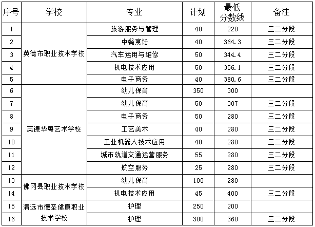 經(jīng)研究,現(xiàn)公布清遠(yuǎn)市第二批中等職業(yè)學(xué)校(含技工學(xué)校)部分專(zhuān)業(yè)招生錄取最低控制分?jǐn)?shù)線(xiàn),具體如下: