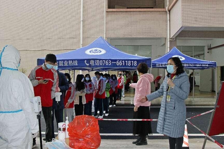 “請摘下口罩,嘴巴張大……”在采樣現(xiàn)場,醫(yī)務(wù)人員正耐心地給同學(xué)們進(jìn)行核酸檢測。檢測當(dāng)天,廣東省連州衛(wèi)生學(xué)校嚴(yán)格按照市疫情防控的要求,堅持“統(tǒng)一指揮、分級負(fù)責(zé)、反應(yīng)及時、措施果斷”原則,現(xiàn)場一共分為六個檢測組,每個檢測組都配有工作人員,進(jìn)行掃碼和登記工作。為避免人員聚集,學(xué)校以班級為單位,錯時錯峰進(jìn)行采樣。在采集現(xiàn)場,所有師生均佩戴口罩,依次間隔1米距離,整個采樣現(xiàn)場秩序井然。在師生、醫(yī)護(hù)人員的密切配合下,檢測過程快速、準(zhǔn)確、規(guī)范。