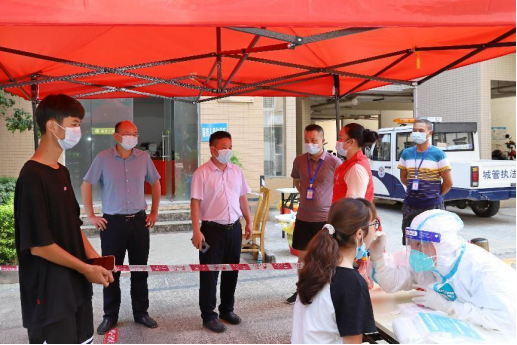 截至7月15日三天的時(shí)間,連州衛(wèi)生學(xué)校共派出505人次參加志愿服務(wù)工作,其中包括黨員教師、飯?zhí)寐毠?、生活老師。他們頂著烈日,即使最高溫度達(dá)39℃,也無怨無悔地忙碌在核酸檢測一線。