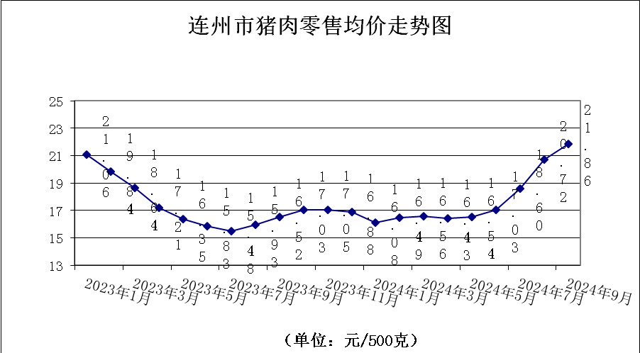 9月份,我市豬肉零售價(jià)格持續(xù)上升,漲幅有所收窄。農(nóng)貿(mào)市場(chǎng)監(jiān)測(cè)的四種主要豬肉零售均價(jià)為21.86元/500克,環(huán)比升5.50%。其中,排骨30.92元/500克,環(huán)比升7.77%;精瘦肉21.50元/500克,環(huán)比升1.99%;肋條肉17.50元/500克,環(huán)比升5.68%,有皮上肉17.50元/500克,環(huán)比升5.68%。