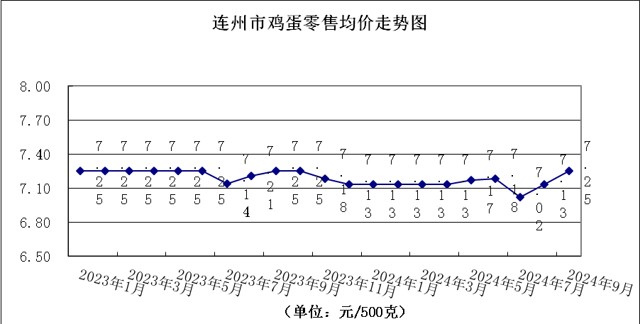 蛋類(lèi)雞蛋平均零售價(jià)格為7.25元/500克,環(huán)比升1.68%。鴨蛋平均零售價(jià)格為8.85元/500克,環(huán)比升2.55%。