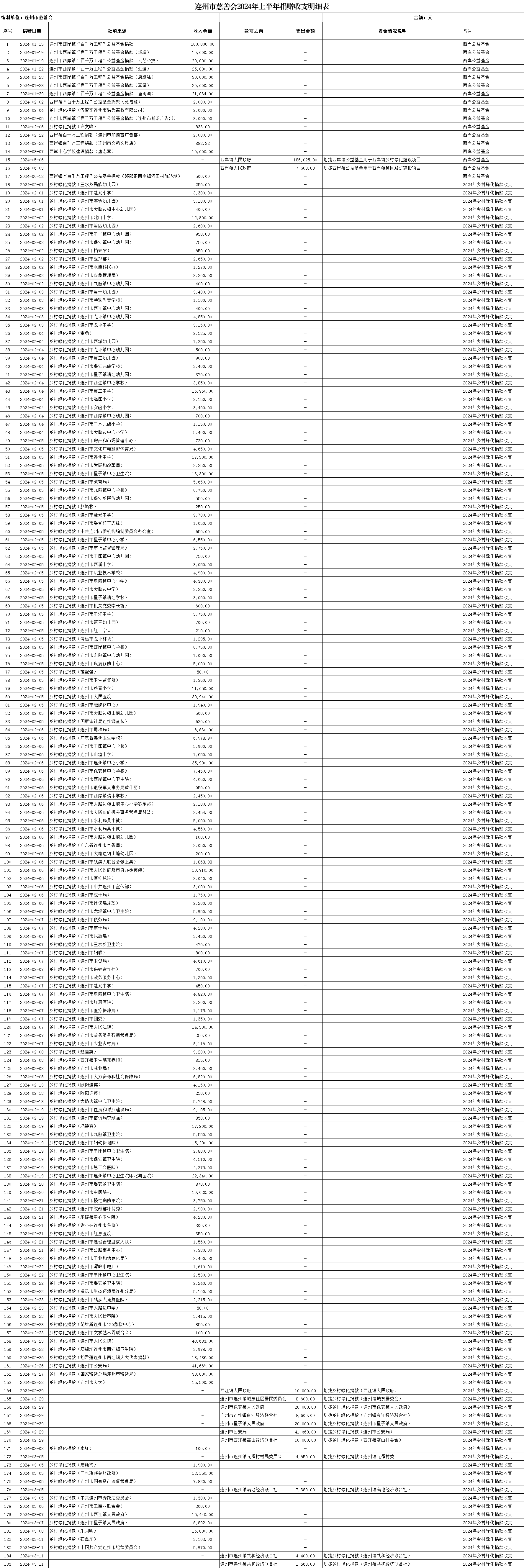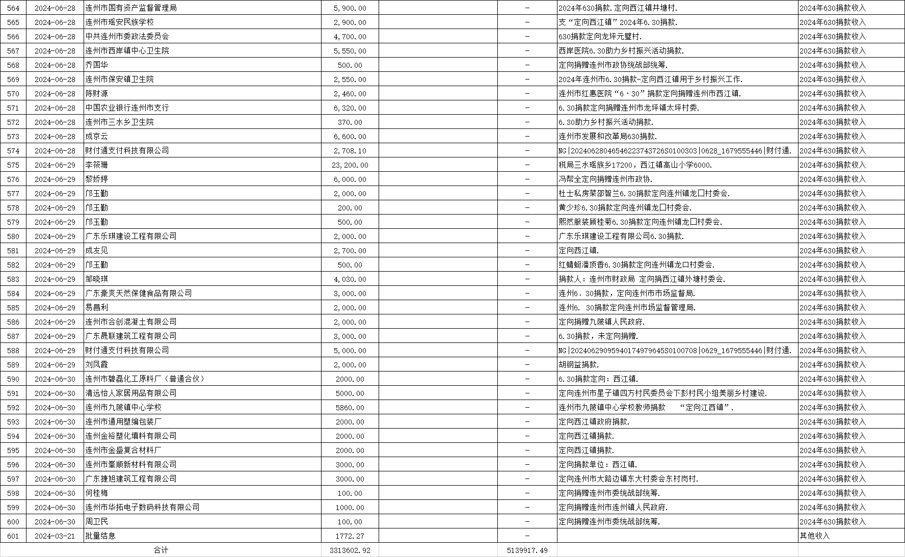 2024年上半年清遠防汛救災捐款收入為1270元、連州教育事業(yè)發(fā)展捐款收入為600000元、保安鎮(zhèn)獎教助學款收入為1000,支出為0元。