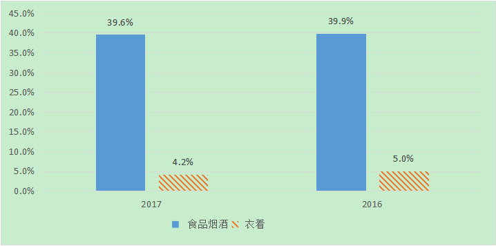 圖1:2016-2017年連州農(nóng)村居民食品煙酒和衣著消費(fèi)支出占比