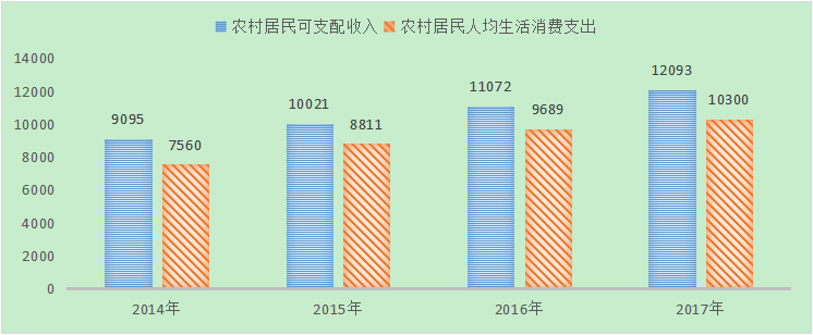 2017年,連州農(nóng)村居民人均生活消費(fèi)支出10300元,比上年增加611元,同比增長6.3%。
