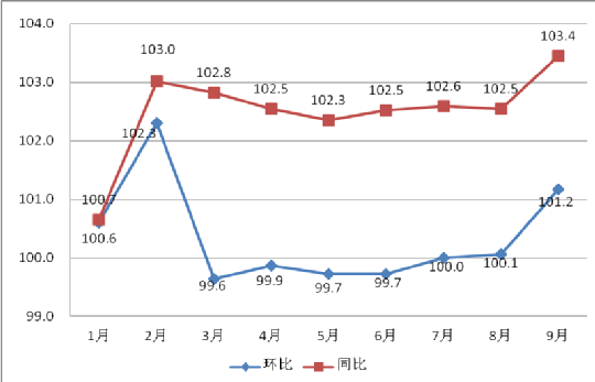 從各月環(huán)比指數(shù)看,前三季度連州CPI“5漲4降”,除2月份受春節(jié)因素影響CPI 上漲2.3%,9月份受臺(tái)風(fēng)和國(guó)家政策調(diào)整導(dǎo)致食品和教育服務(wù)等價(jià)格上漲,影響CPI上漲1.2個(gè)百分點(diǎn)外,其余月份漲跌幅均未超過(guò)0.7個(gè)百分點(diǎn)。