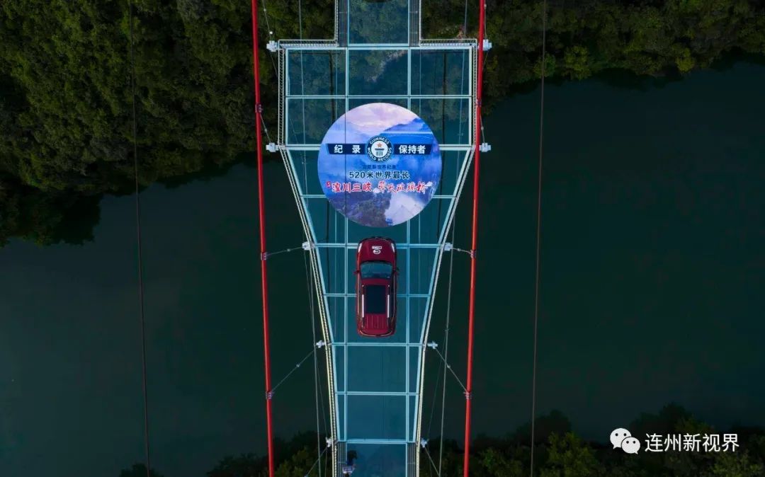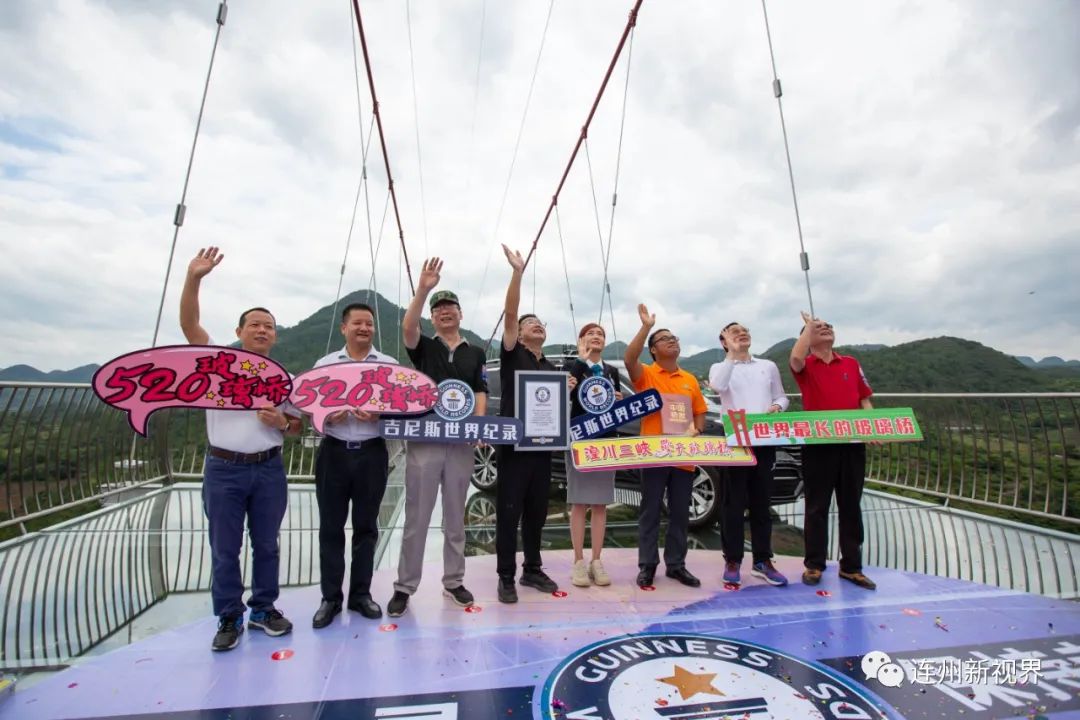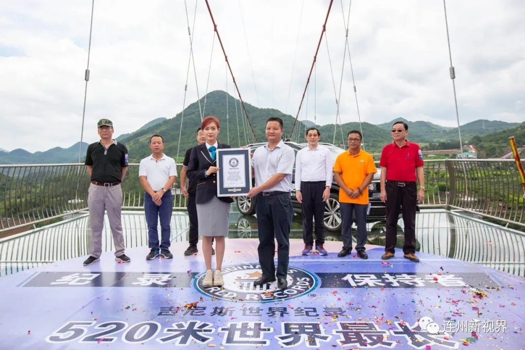 當(dāng)天上午,吉尼斯世界紀(jì)錄的認(rèn)證官侯穎在九陂鎮(zhèn)領(lǐng)導(dǎo)和廣汽集團(tuán)、愛(ài)地旅游、擎天旅游有關(guān)負(fù)責(zé)人的陪同下,乘坐廣汽傳祺SUV,橫跨玻璃橋,成功抵達(dá)4號(hào)觀景臺(tái),并在玻璃橋上宣布:擎天玻璃橋有效長(zhǎng)度為526.14米,成功打破這項(xiàng)全新的吉尼斯世界紀(jì)錄稱號(hào)。