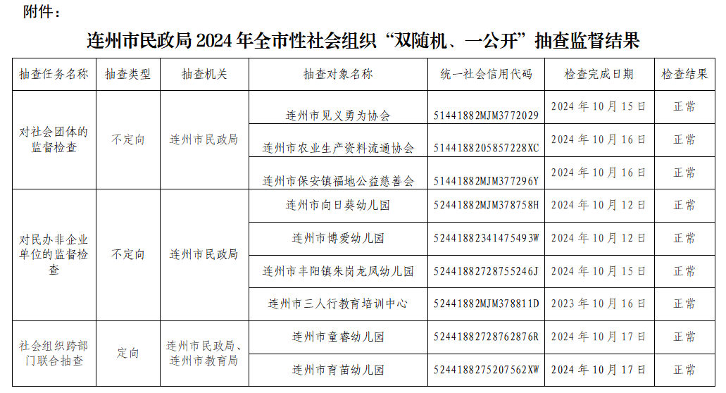 連州市民政局關于2024年全市性社會組織“雙隨機、一公開”抽查監(jiān)督結果公布