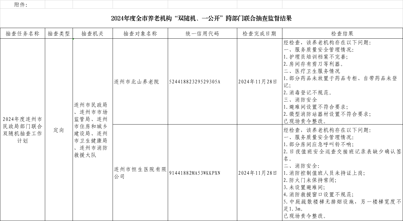 連州市民政局關(guān)于2024年度全市養(yǎng)老機構(gòu)“雙隨機、一公開”跨部門聯(lián)合抽查監(jiān)督結(jié)果的公示