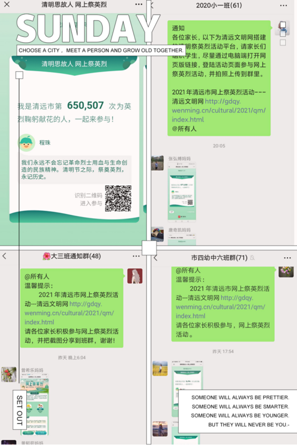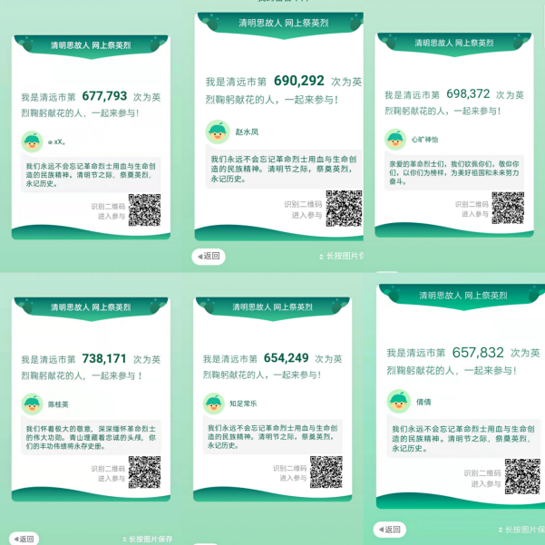 組織廣大教師,家長和幼兒大手牽小手登錄中國文明網、央視網、“文明清遠”公眾號等平臺,通過在網上向先賢先烈鞠躬獻花、抒寫感言寄語的方式,表達對先烈先賢的感恩和敬仰,繼承和發(fā)揚革命精神。